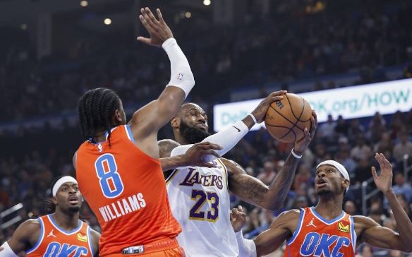 比赛开始,变阵的湖人防守端并没有很好地限制住对手,亚历山大进攻端非常稳定再次单节上双,而八村塁也成为替补奇兵,双方展开对攻战,雷霆首节轰出39分领先3分,次节拉塞尔里突外投连砍8分,湖人一波13-3攻击波直接反超比分,霍姆格伦攻防建功止血,但湖人接连中投又是11-2进攻波再次拉开双位数领先,半场湖人领先12分。下半场,双方上来展开拉锯战,詹姆斯里突外投连续取分,加上与浓眉的配合,湖人一度拉开20分以上领先,亚历山大单节15分又是苦苦支撑,末节杰伦-威廉姆斯联手霍姆格伦追分,詹姆斯里突外投连砍15分帮助湖人牢牢守住双位数左右领先,最终湖人力克雷霆,终止4连败。